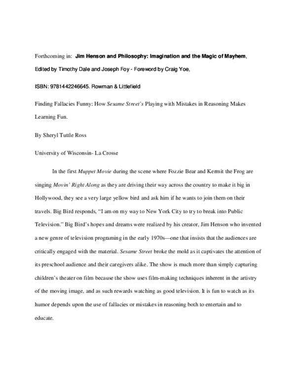 Pdf Finding Fallacies Funny How Sesame Street S Playing With Mistakes In Reasoning Makes Learning Fun Sheryl Tuttle Ross Academia Edu